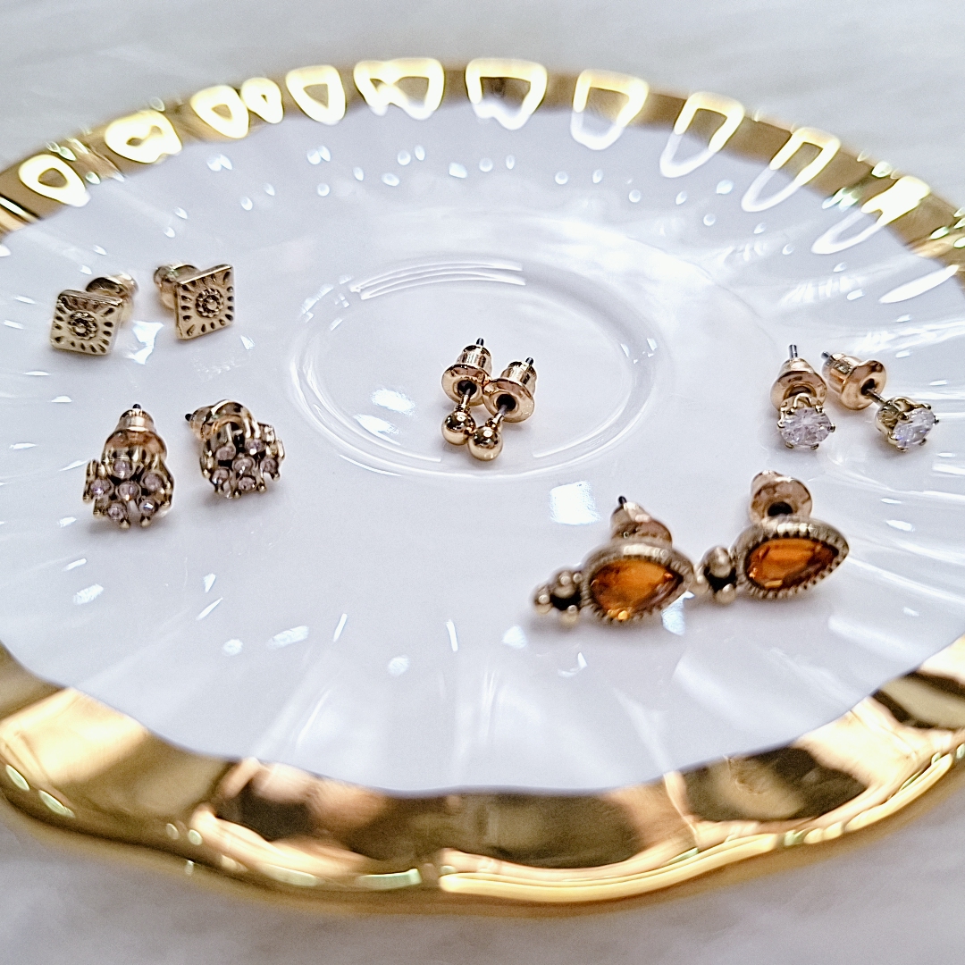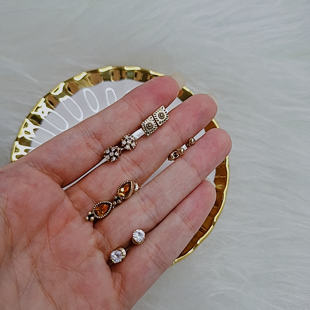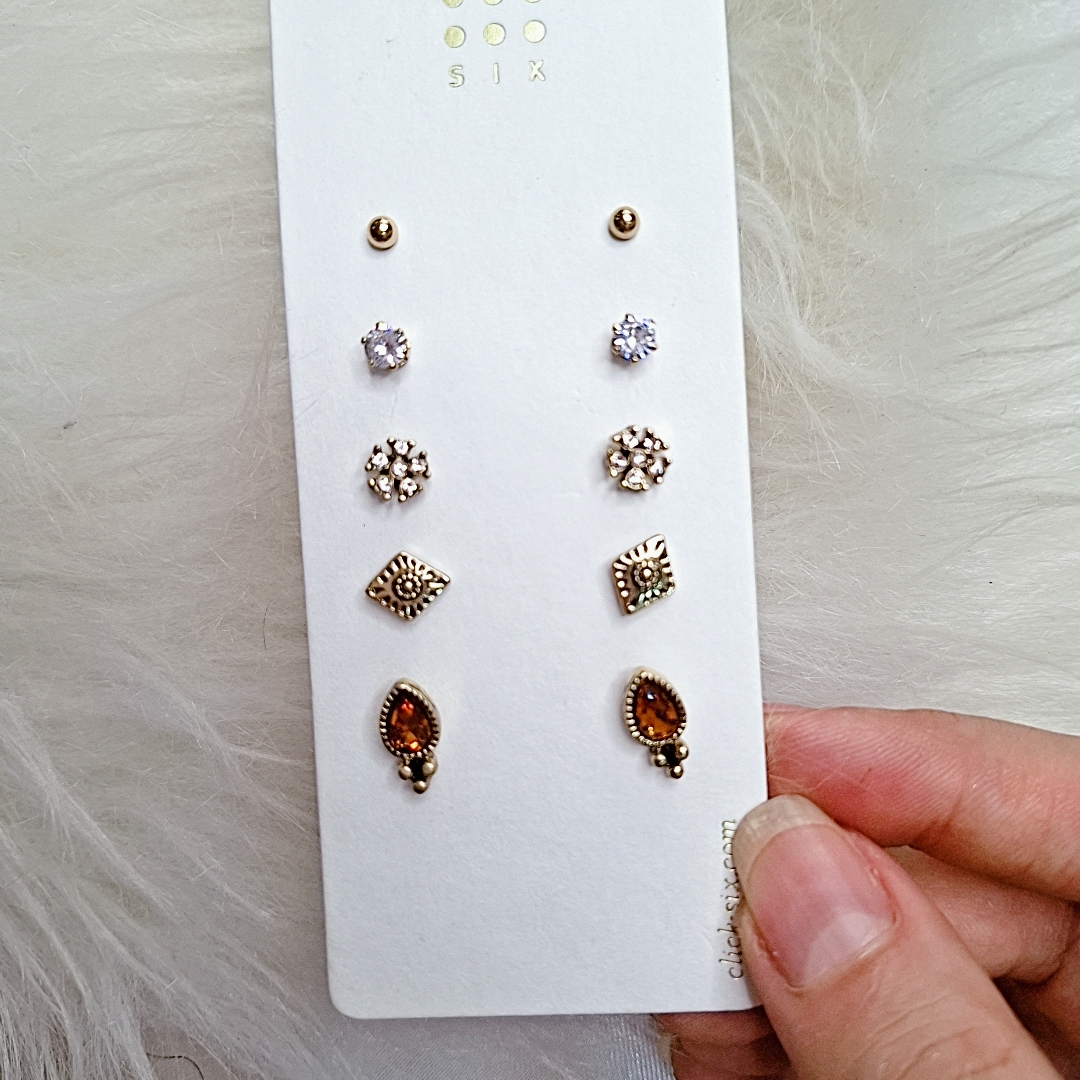 پک پنج جفتی گوشواره میخی برند six وارداتی و محدود طرح خاص و شیک میخی یکی از گل گوشها کمی کج شده، تخفیف لحاظ شده.