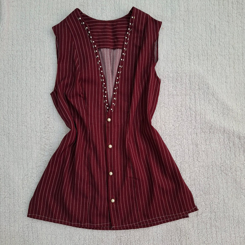 شومیز سارافون زنانه مدل یقه باز مروارید دوزی شده رنگ زرشکی راه راه