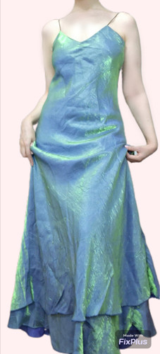 پیراهن زنانه یقه توری چاک دار ماکسی تمام شاین رنگ نقره ای آبی پشت مدلدار سایز ۳۸ و ۴۰