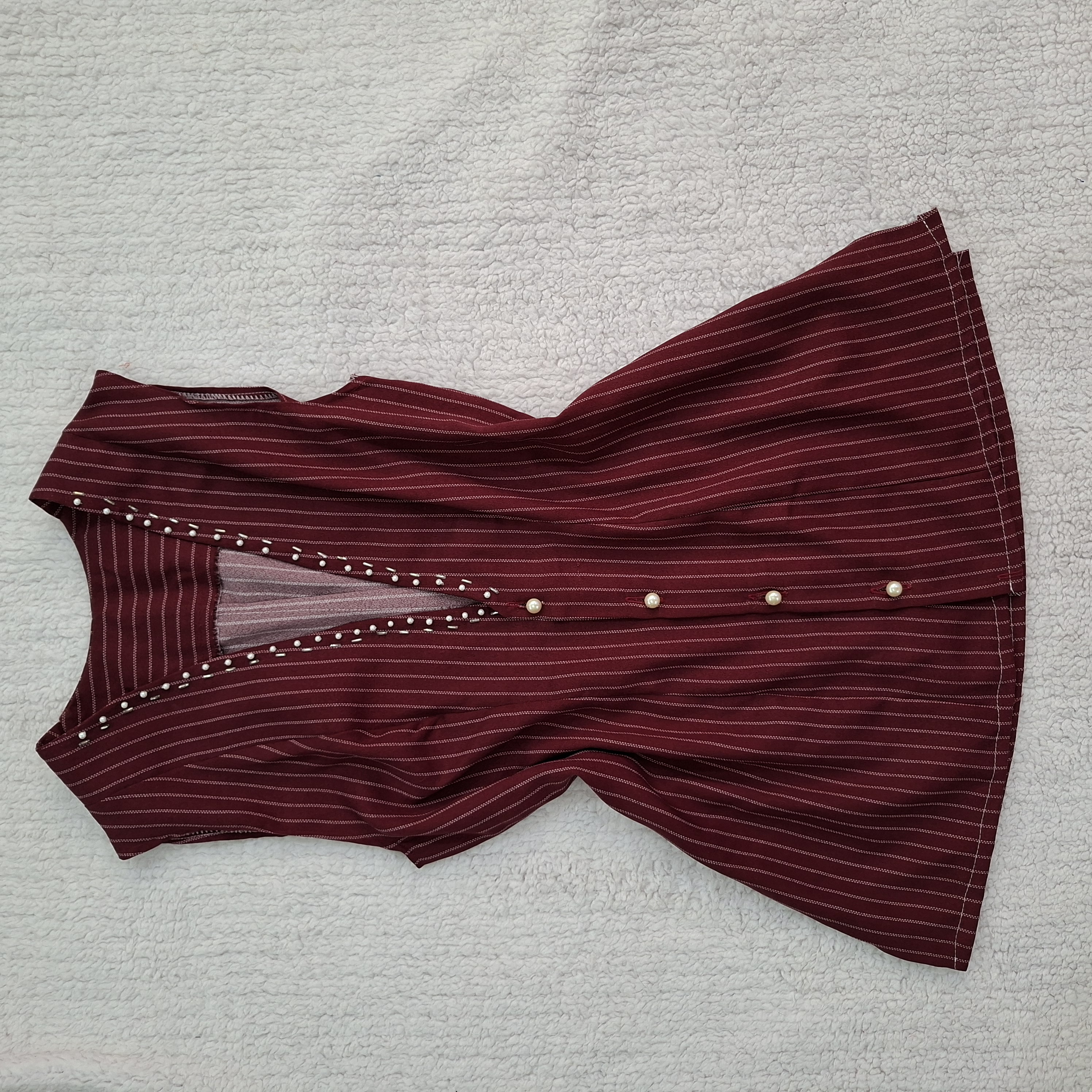 شومیز سارافون زنانه مدل یقه باز مروارید دوزی شده رنگ زرشکی راه راه