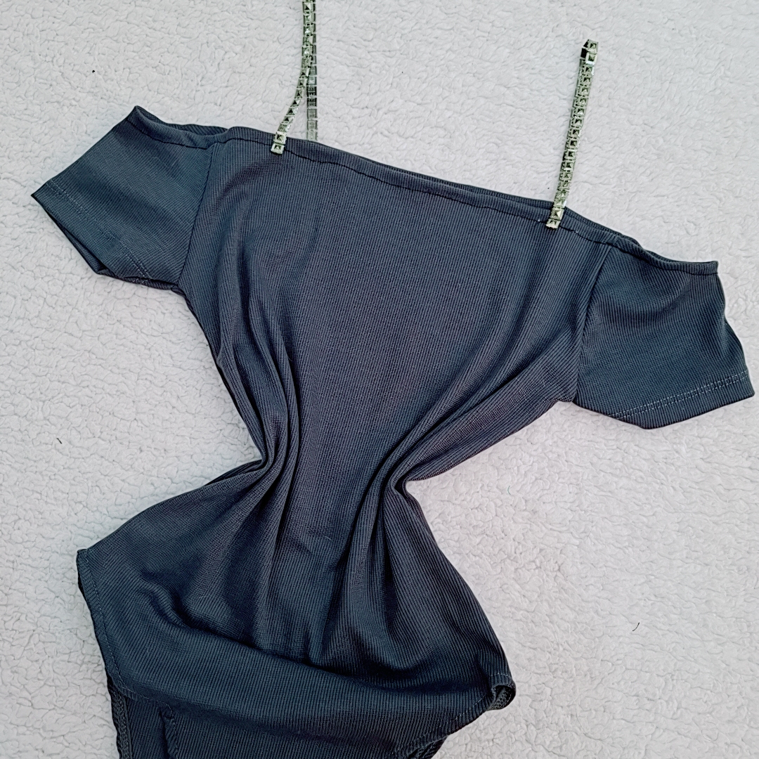 بادی زنانه یقه قایقی آف شولدر شیک رنگ دودی خاکستری تیره فری سایز بند تزیینی